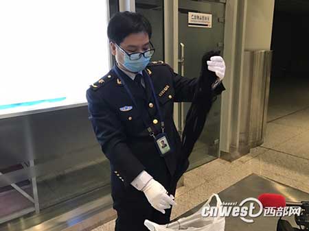 西安咸陽機場出入境檢驗檢疫局科長楊安寧:“行李包裝中有一團人發,打開以后,油膩膩的、臟兮兮的,而且目測還帶有白色的像可疑頭皮屑一樣的東西,也散發出來一種不好聞的異味。”